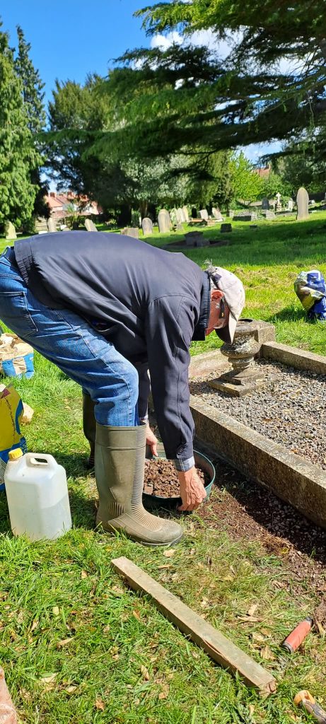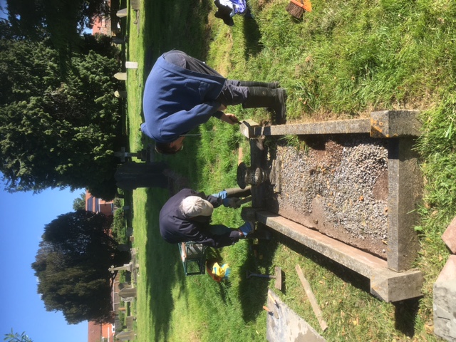 Back to work Chris worked on cleaning out the weeds, grass and ivy from the Lear grave J17, he took out all the chipping and bagged them up, and will be sieved and cleaned on another visit, doing a good job. Alan cleaned out the weeds, grass and ivy from the Greenslade grave J39, this grave has a membrane, and the grass has penetrated through this and will need to be removed and replaced. The stone chipping will need to be removed, sieved and washed. Rita started work on the Hook grave which was badly overgrown and will need more work here.  All in all, a good sessions work.