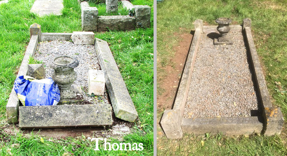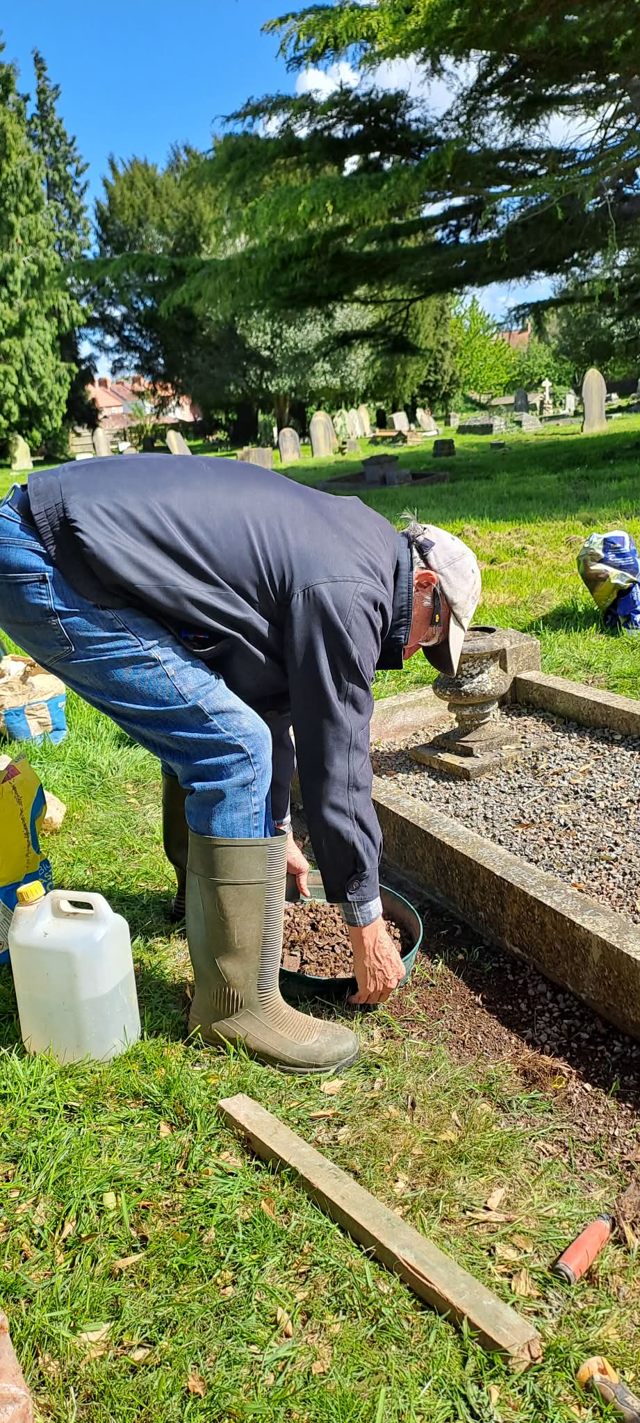 Alan went up to the Thomas grave J58 where one long kerb and one short kerb had been pushed out of place and three of the posts were loose. The job today was to cement everything back into place. Chris came in and mixed up the cement; the kerbs and posts were soon put back into place. One bag of stone chipping from the grave needed to be sieved to remove the earth and needs to be washed before returning to the grave.