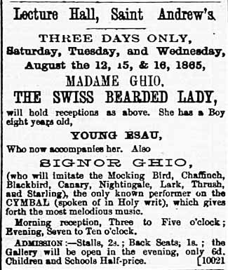 In the second half of 1867, they had a substantial contract to appear at the Fleur de Lys Music Hall in Sheffield (one of 6 music halls in the city). Ten other acts were on the bill, including comics, singers and dancers. After this there was a change and Signor Ghio was no longer performing with Josephine, he had probably died (her newspaper death notice refers to her two husbands). This would have been a difficult time for Josephine. As well as her grief, she had to continue to work and needed some help to set up and pack away her booth/pavilion, as well as provide a deterrent to over-familiar people intent on pulling her beard. Albert was still only fourteen and would not be strong enough.