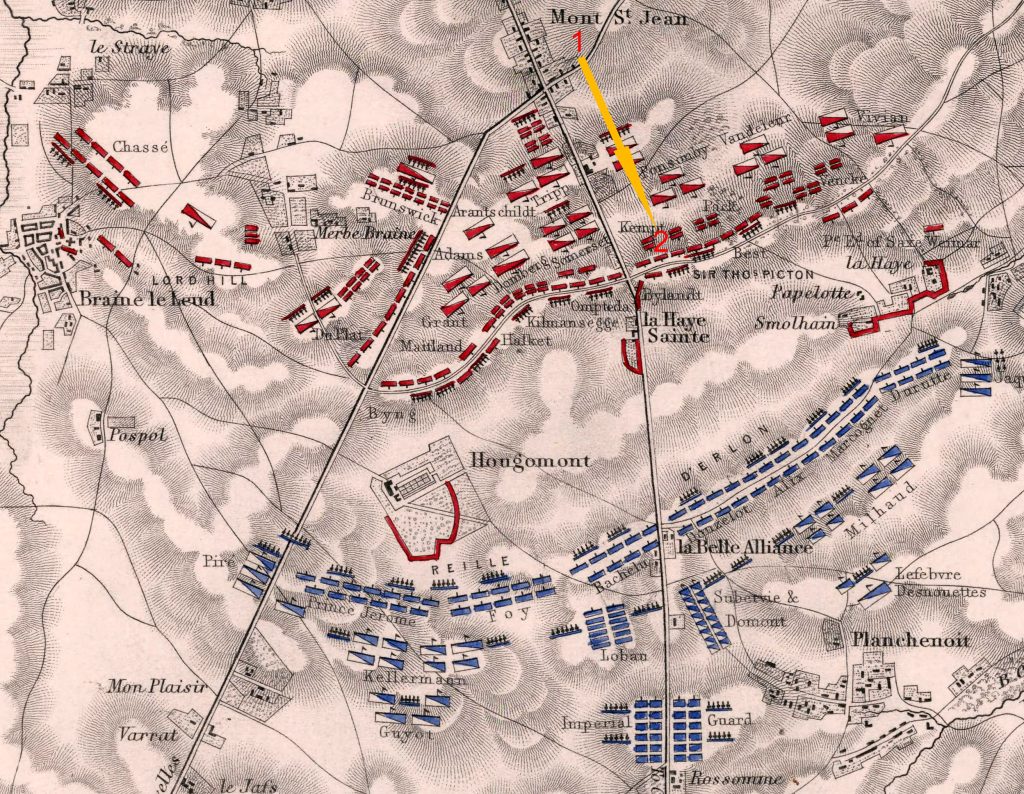 George and the 40th Regiment were initially in the reserve of the army near the farm of Mont St. Jean. At about noon the battle commenced with artillery fire. For the next couple of hours, the 40th remained in place, behind the front lines. Mont St Jean was used as a field hospital, so George may have seen a steady stream of horribly wounded men limping or being carried to the farmhouse.
